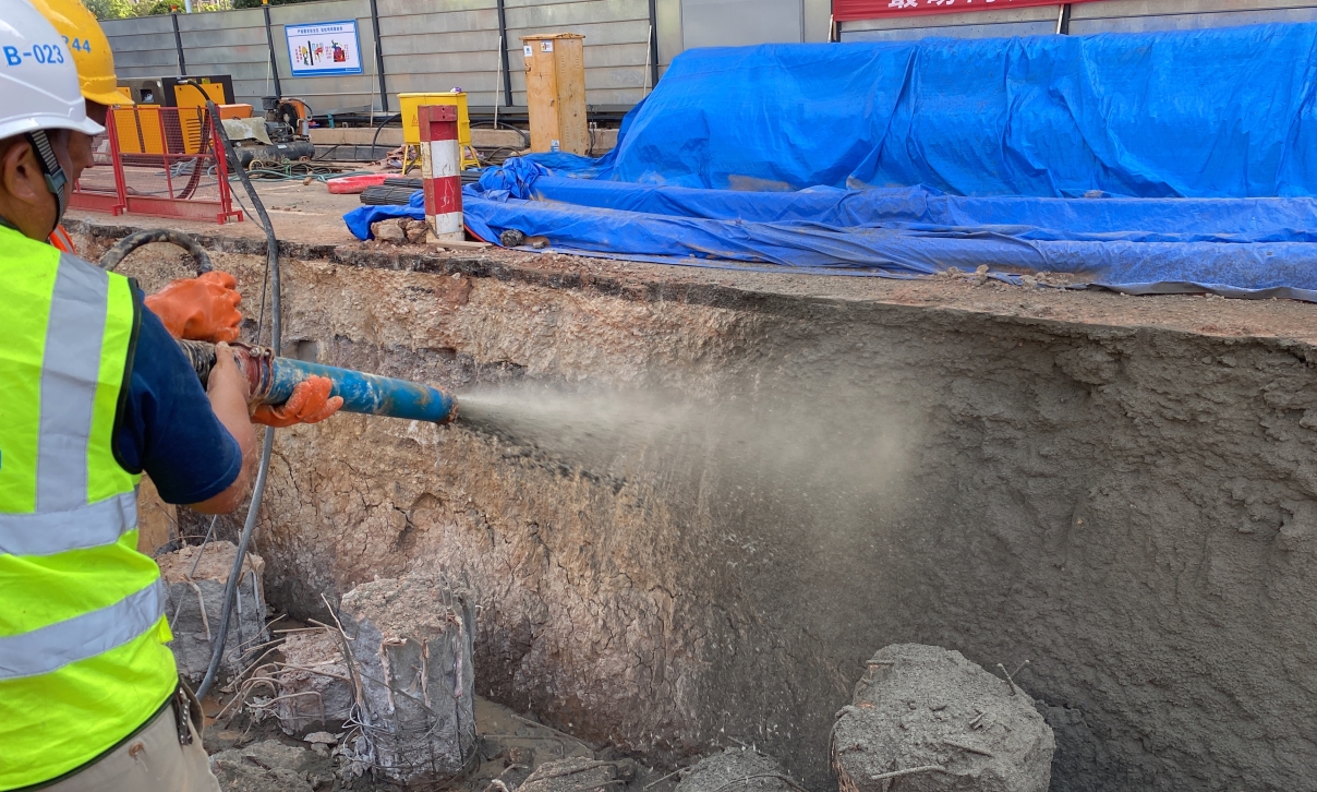 湖南長沙地鐵站項(xiàng)目,由中國建筑五局承建,訂購液壓濕噴機(jī)主要用于基坑支護(hù),總施工面積100000平,為保證工期,客戶要求單日噴漿面積達(dá)到1000平方,水平輸送距離達(dá)到50米。根據(jù)客戶工程需求,產(chǎn)品經(jīng)理為客戶推薦YG-90型單噴頭液壓濕噴機(jī),配套豫工電動16立方空氣壓縮機(jī)。液壓濕噴機(jī)采用骨料粒徑15mm的漿料,在16立方電動空壓機(jī)的完美配合下,高效噴漿,每小時噴漿量達(dá)到7m3,輸送距離輕松達(dá)到50米,完全滿足客戶施工需求。