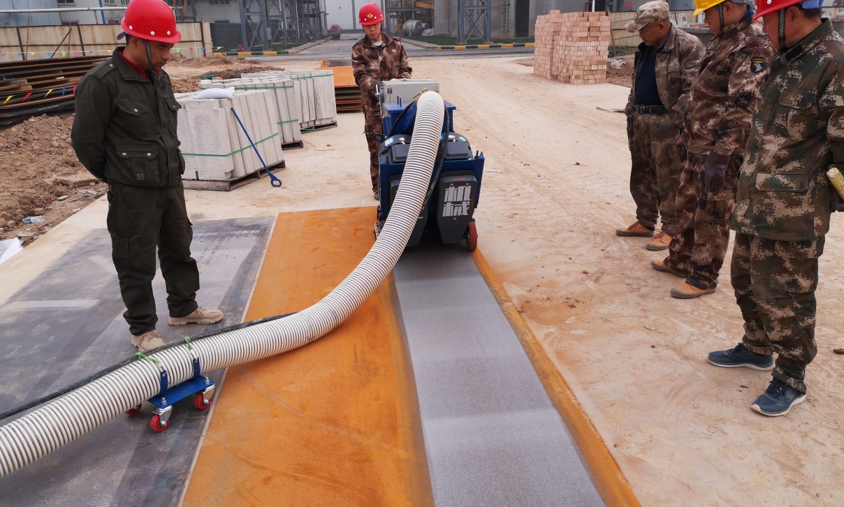 鋼板除銹施工,第一次用磨光機(jī),有粉塵,環(huán)保局不通過(guò),改用濕噴機(jī),排出的污水污染下水道,村委會(huì)不讓用,后選擇豫工路面拋丸機(jī),無(wú)塵環(huán)保,客戶(hù)滿(mǎn)意,甲方點(diǎn)贊